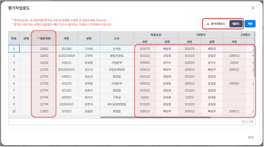 평가자 업로드를 위해 양식다운로드를 하시면, 대상자ID를 확인하여 작성 후 업로드해 주시기 바랍니다.