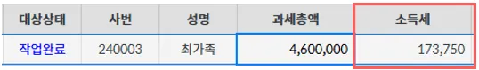 소득세 계산 : 186,250원 - 12,500원 = 173,750원