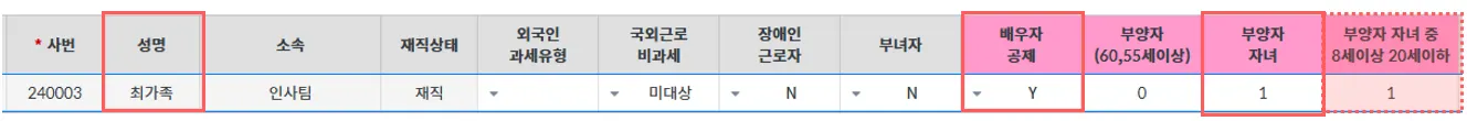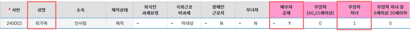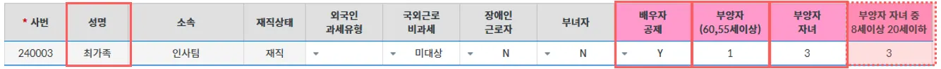 표시된 항목 외에 장애인근로자, 부녀자, 경로우대등은 이력 확인용으로 부양가족에 불포함