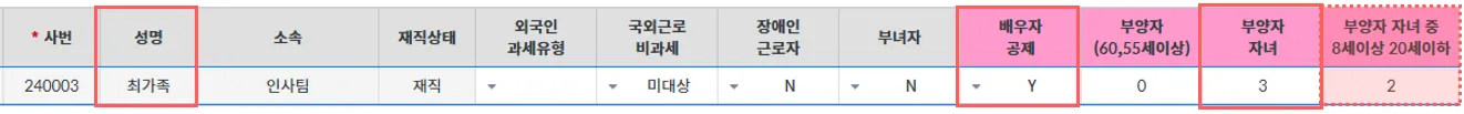 부양가족 정보를 관리하는 화면으로 표시된 인원들을 토대로 부양가족 인원을 산정합니다.