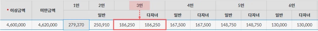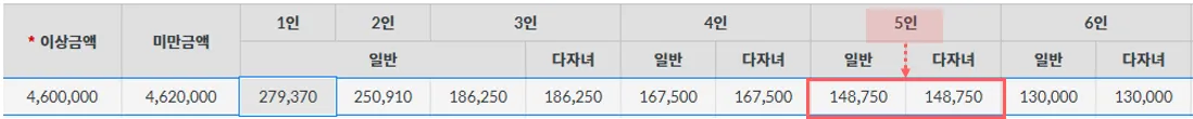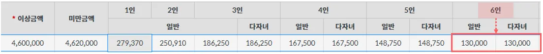 본인 1명, 배우자 1명, 부양자 4명 (8세 이상 20세 이하 자녀 : 3명)