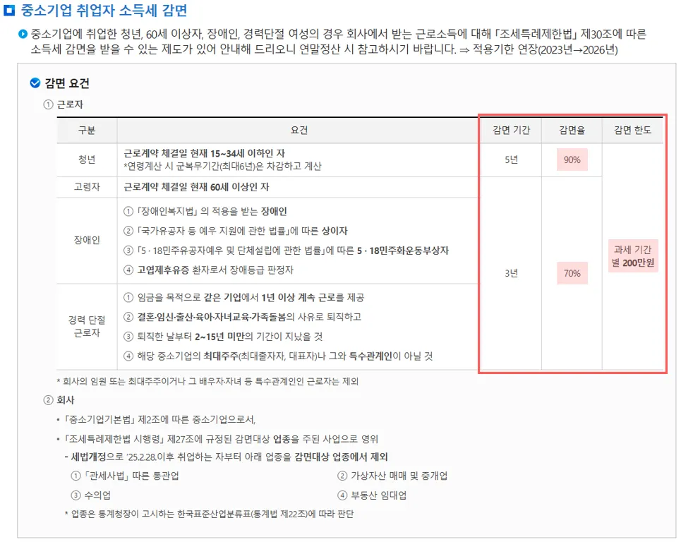 <국세청 홈페이지 중소기업 취업자 감면 내용 https://www.nts.go.kr/nts/cm/cntnts/cntntsView.do?mi=40611&cntntsId=239023>