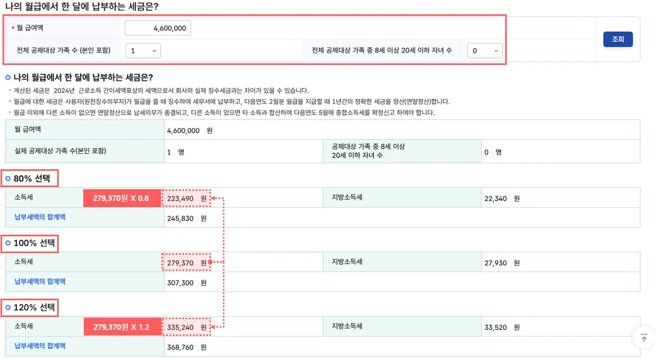 일반적으로 80%(원 소득세 X 0.8), 100%(원 소득세), 120%(원 소득세 X 1.2) 형태로 조정 가능