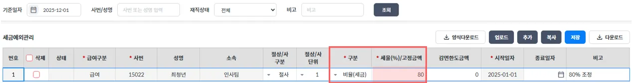 세금예외적용을 비율(세금)으로 하고 80을 적용하면 80% 요율로 소득세로 계산