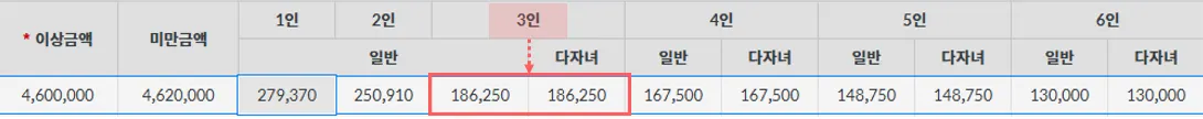 본인 1명, 배우자 1명, 부양자 1명 (8세 이상 20세 이하 자녀 : 1명)