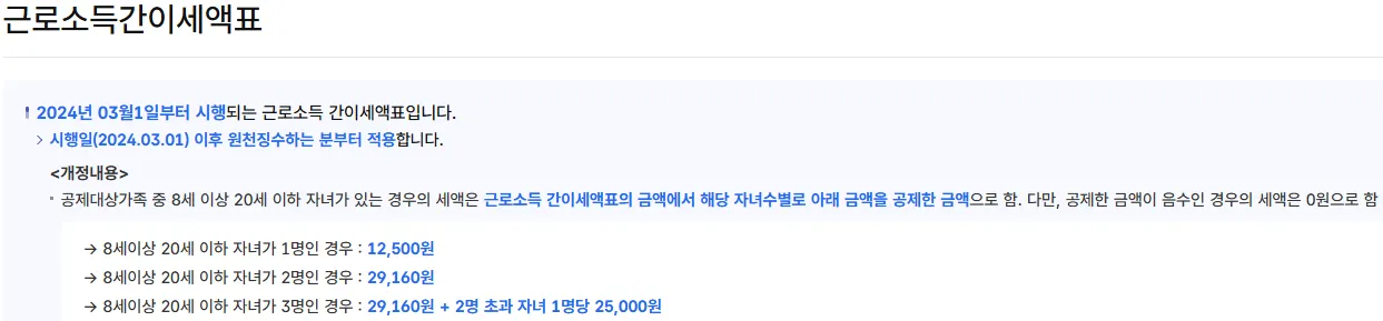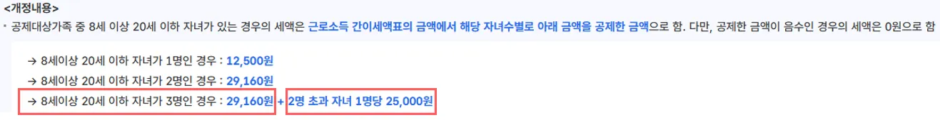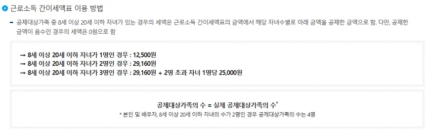 → 공제대상가족 중 8세 이상 20세 이하 자녀가 있는 경우, 근로소득 간이세액표의 금액에서 해당 자녀수별로 아래 금액을 추가 공제