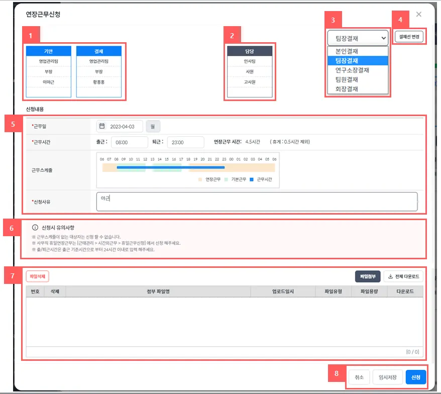 ⑦ 첨부파일 허용시 임직원이 각 업무신청시 파일을 첨부할 수 있음