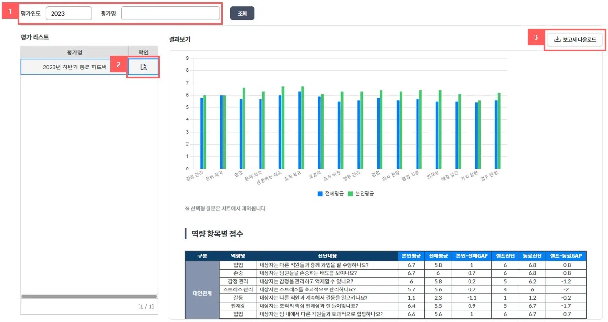 ② 대상년도에 포함된 다면평가 리스트를 확인하고 레포트 보기 클릭