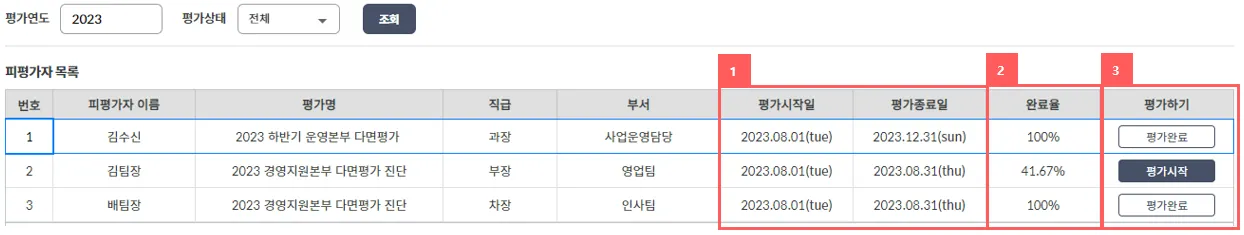 배포된 다면평가를 리스트로 확인하고 평가하는 화면입니다.