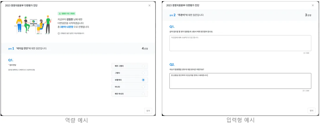 다면평가를 진행하는 팝업으로 입력형 주관식에 대한 예시 화면입니다.