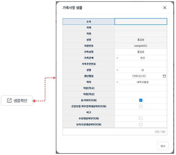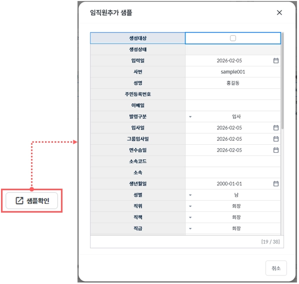 임직원 추가에 어떤 항목들을 넣어야 할지 확인을 하고 싶으시면 샘플보기 팝업을 통해 확인할 수 있습니다.