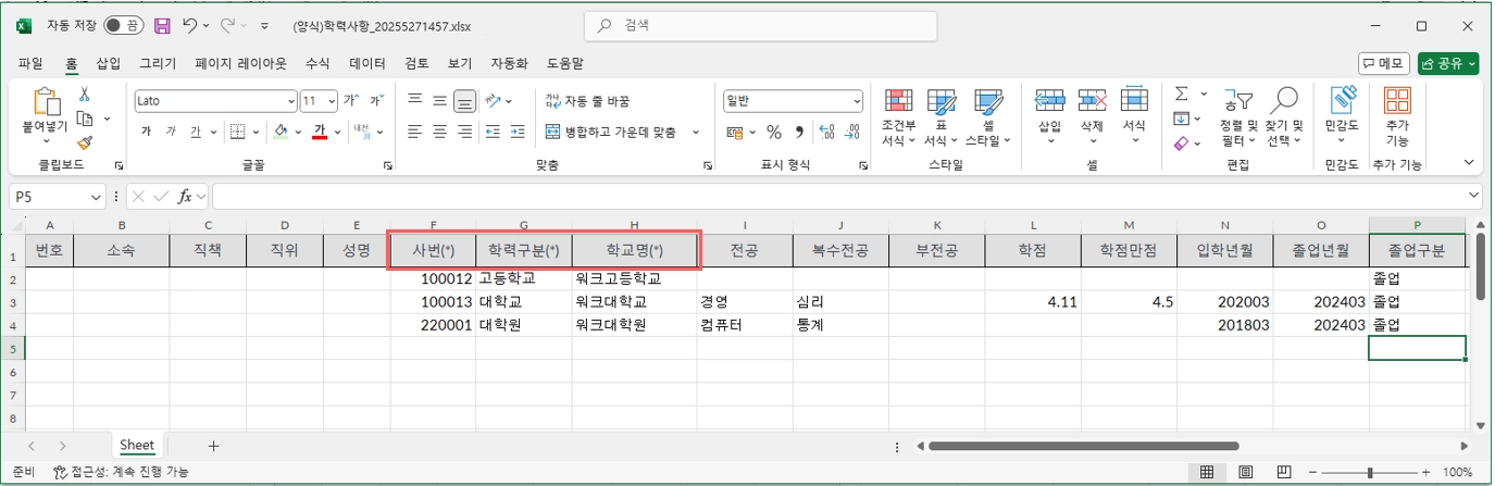 <다운로드한 엑셀에 필수값을 작성하여 완성 후 업로드>