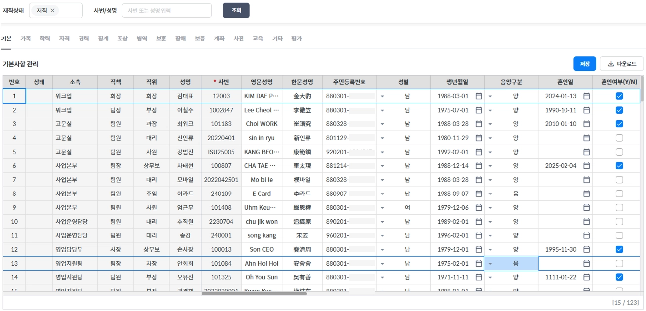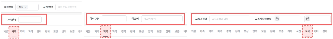 기본정보외에 가족, 학력, 자격사항등 탭별로 임직원들의 인사 정보를 조회 및 관리할 수 있는 권한이 적용된 화면입니다.