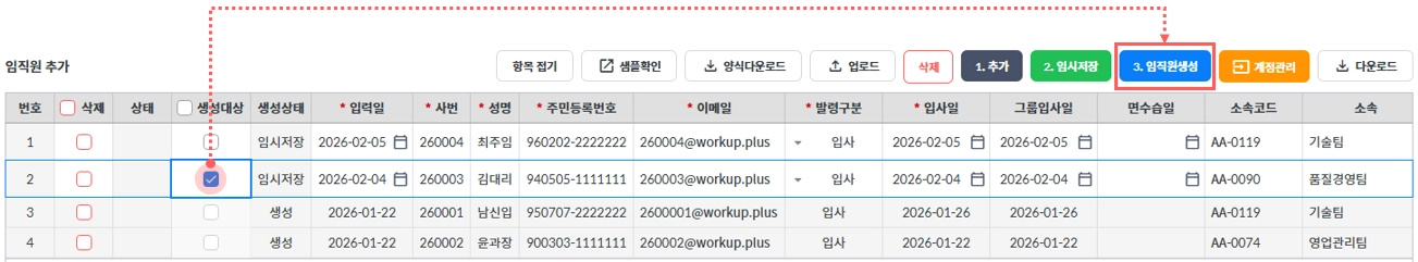 생성대상에 체크하고 임직원 생성을 누르면 워크업에 구성원으로 등록됩니다.