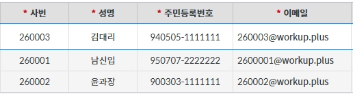 워크업에서는 사번을 키값으로 데이터가 관리되고 이메일 주소가 로그인하는 계정이 됩니다.