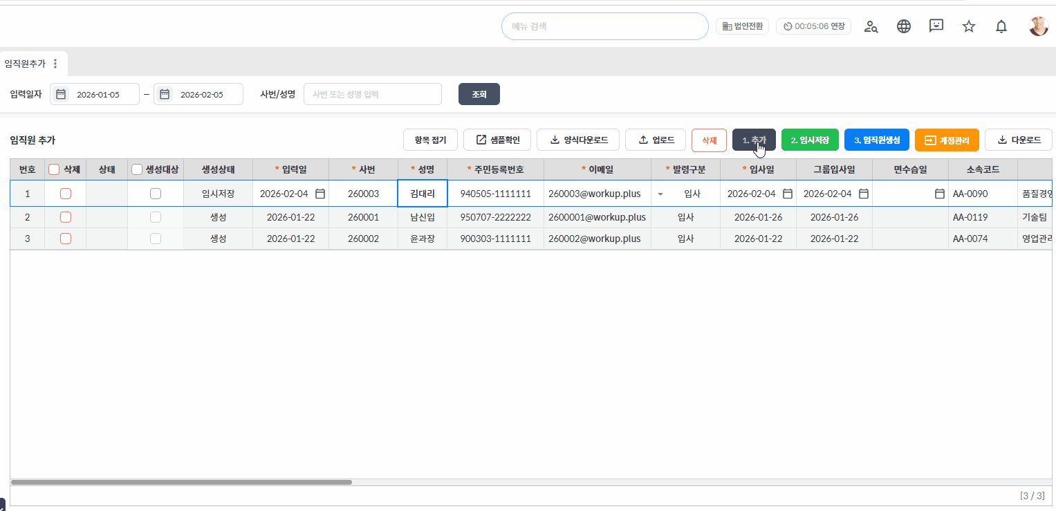 임직원 생성 : 워크업에 신규 직원으로 등록하는 절차 (로그인 계정 아직 없음)