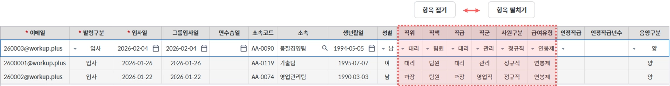 신규 직원 등록에 필요한 항목이 많기 때문에 항목 접기/펼치기를 통해 추가 컬럼들을 확인할 수 있습니다.