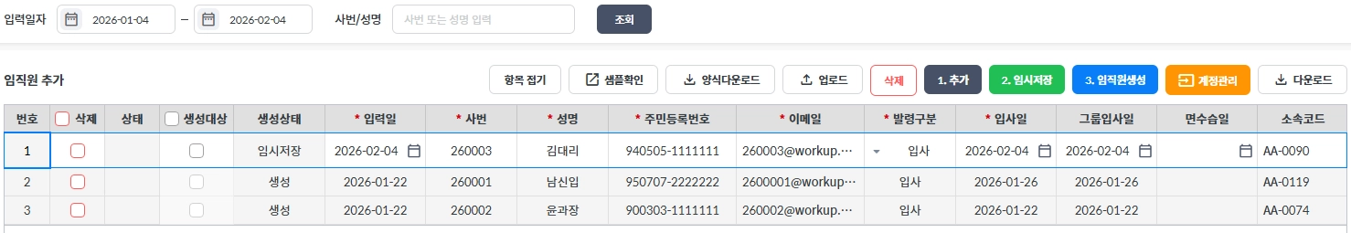사번, 성명, 주민등록번호, 이메일등 기반으로 직원정보를 생성할 수 있습니다.