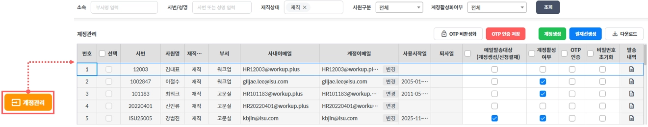 계정생성 : 워크업 임직원으로 등록 된 이후, 로그인할 수 있는 계정을 발급하는 절차