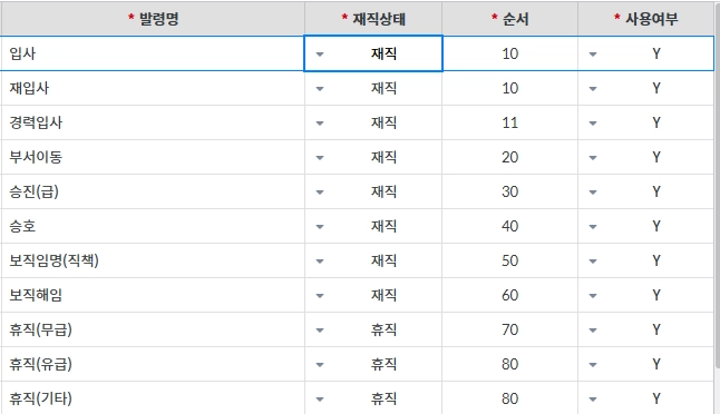 그외 재직상태, 순서, 사용여부 기준을 설정하여 사용합니다.