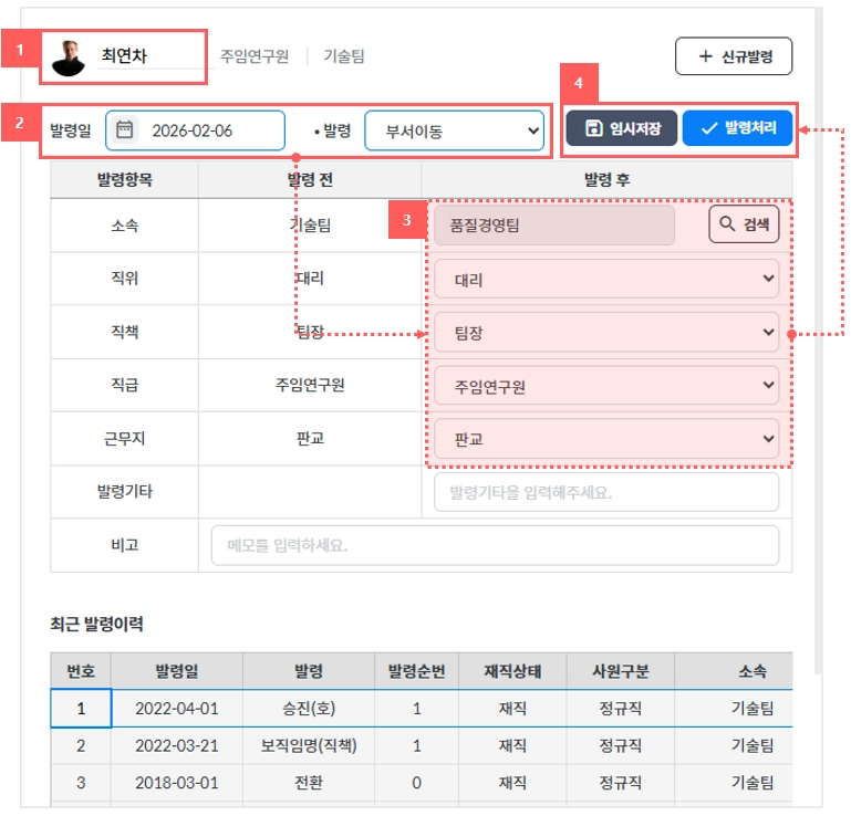 발령 작업을 진행할 대상자 검색을 시작으로 발령 일자를 지정하고 발령처리 업무를 진행합니다.