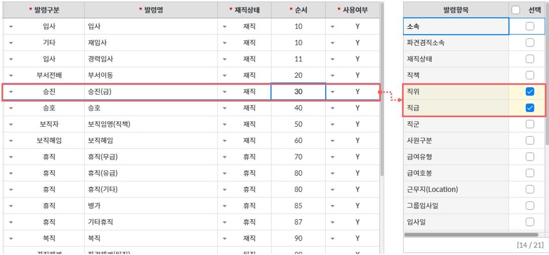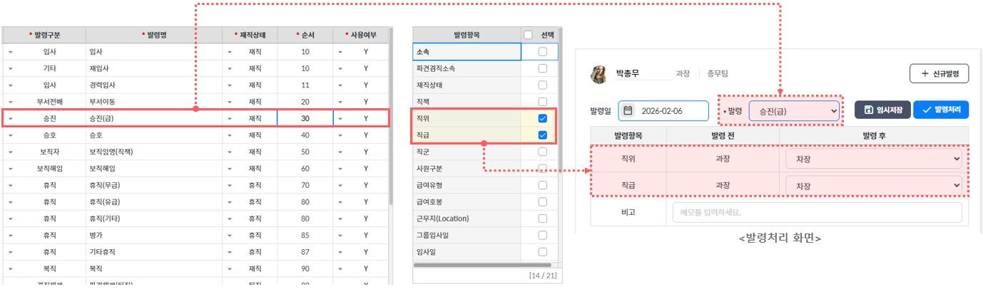 각 발령 종류별 설정된 항목에 따라 발령처리 작업에 적용됩니다.