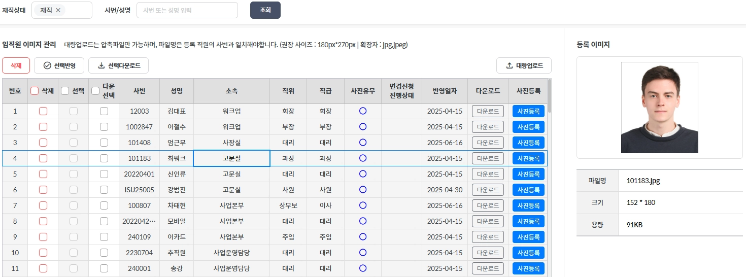 임직원들의 사진을 확인 및 등록하는 화면입니다.