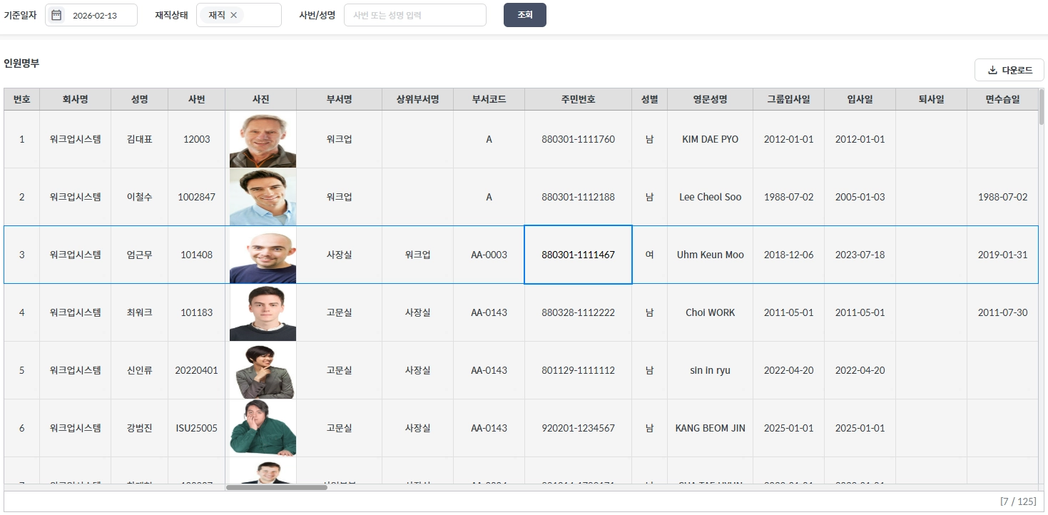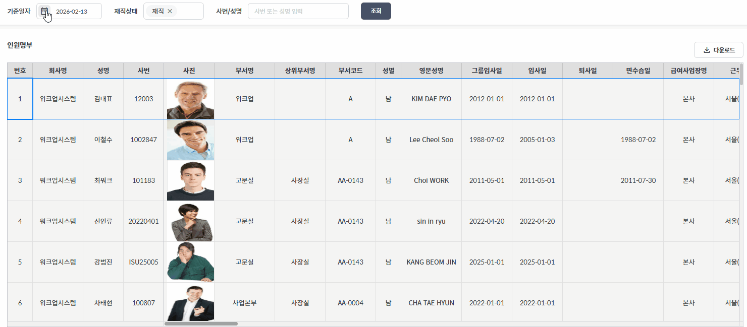 조회하고 싶은 기준 일자를 선택한 후 조직, 직위, 직급등 인원명부를 확인할 수 있습니다.