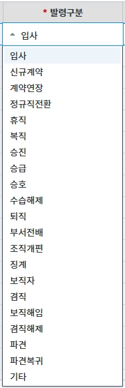 발령구분은 시스템 코드로 고정이며, 발령 종류에 맞춰서 이후 업무 프로세스가 연계됩니다.