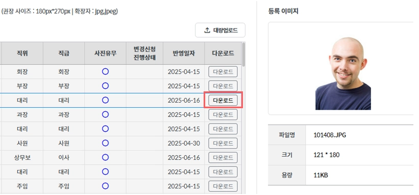 특정 대상자의 사진을 다운로드 하고 싶을 경우 다운로드 버튼을 클릭하면 됩니다.