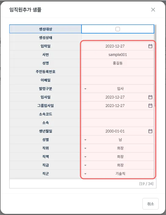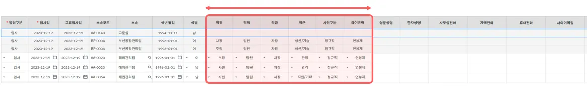 사번, 성명, 직위, 직책, 소속등 개인별 인사정보를 일괄등록 및 발령처리등을 활용하여 추가할 수 있습니다.