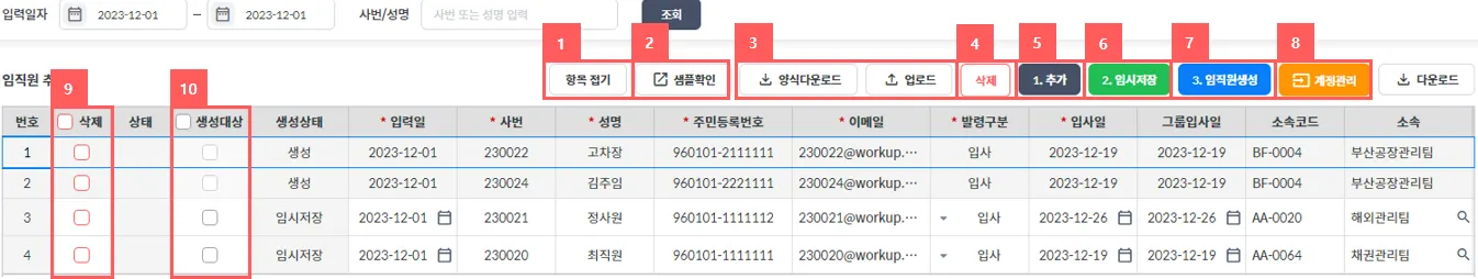 ⑦ ⑩ 생성대상을 체크 한 후 임직원생성