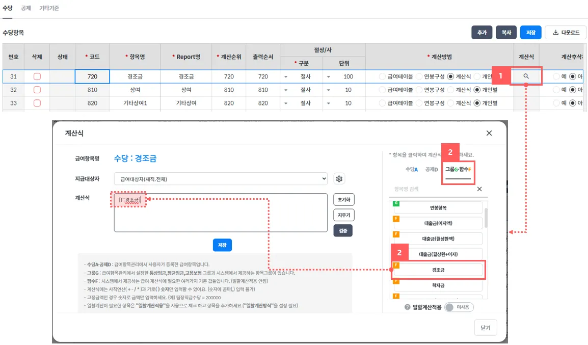 ① 반영할 수당 or 공제 항목을 계산식으로 구성