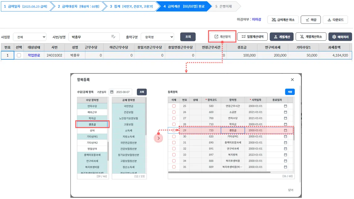 작업할 급여일자에 계산항목으로 구성되어 있는지 확인 후 없다면 등록해주시면 됩니다.