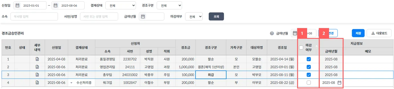 복리후생 신청건들에 대해 마감 및 급여반영 년월을 지정합니다.
