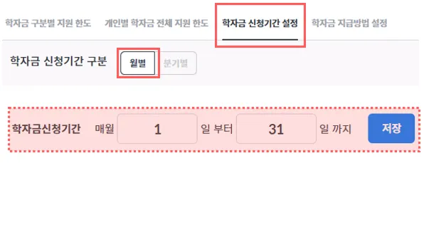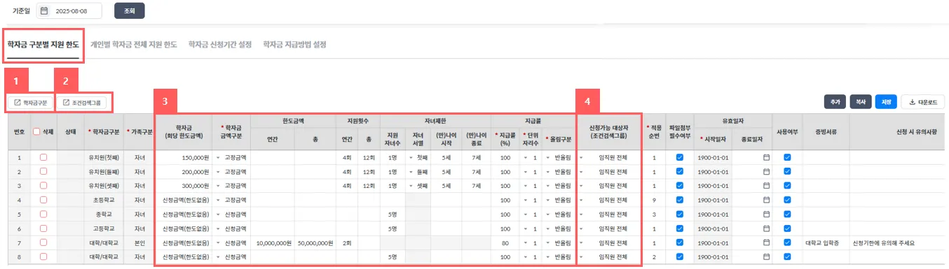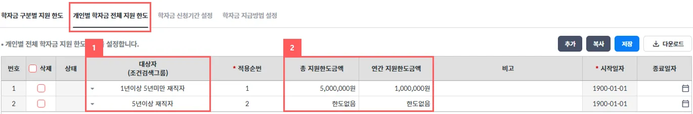 학자금 지원 대상 및 개인별 지원 한도를 설정하는 화면 입니다.