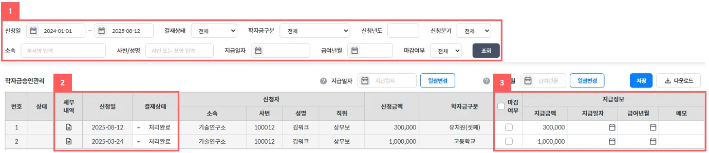 학자금금신청 내역을 확인하며 관리할 수 있는 담당자용 화면입니다.