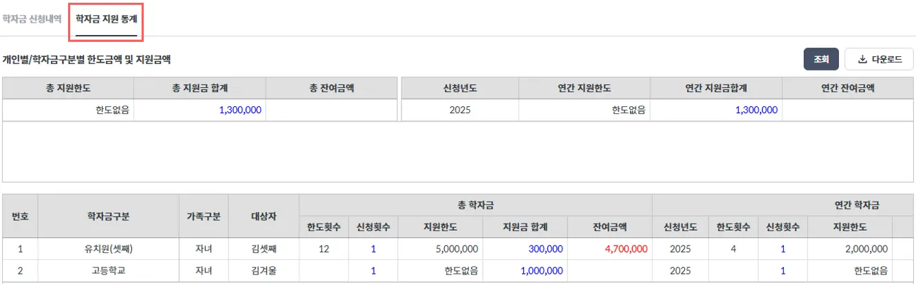 ① 학자금 지원 금액 및 본인에게 남은 한도금액 확인
