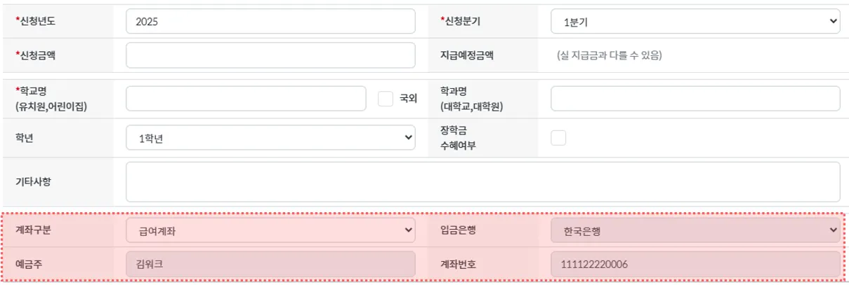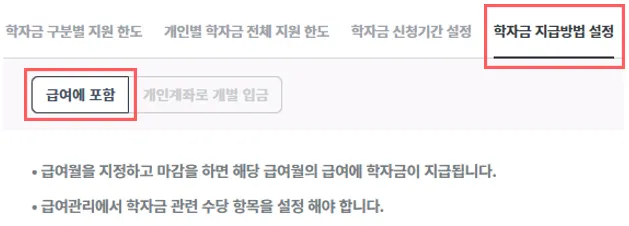 급여에 포함 : 복리후생 마감을 통해 급여에 반영하는 옵션 (학자금 신청시 별도 은행 및 계좌번호 칸 비활성화)