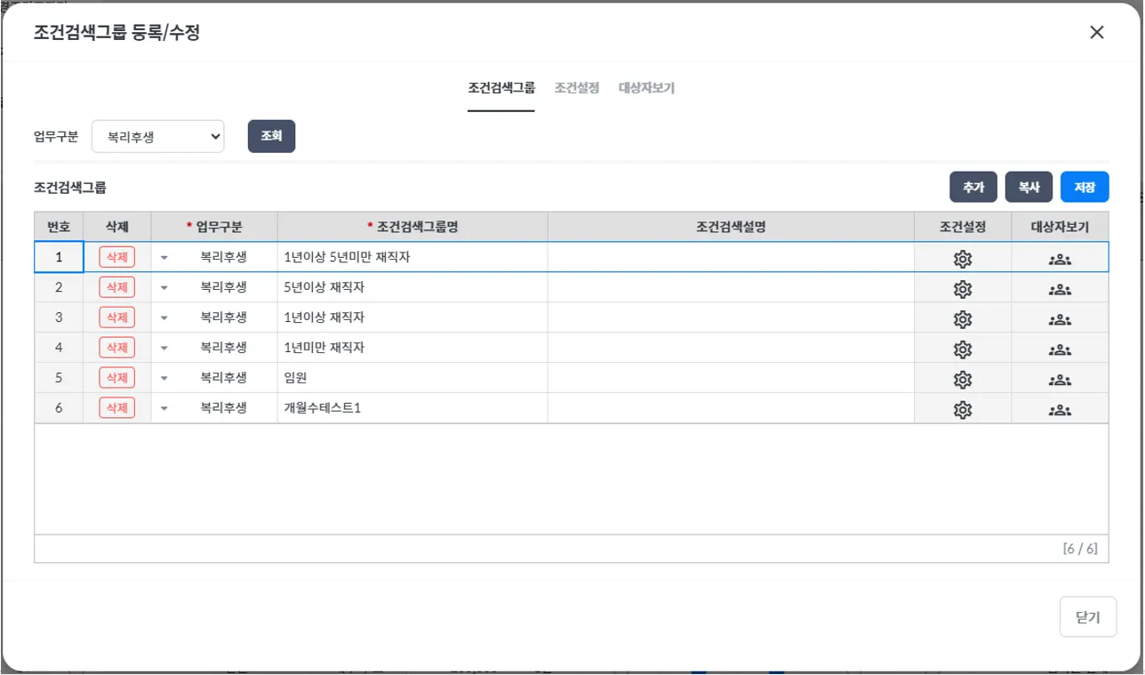 <대상자의 조건을 등록하는 조건검색그룹 팝업>