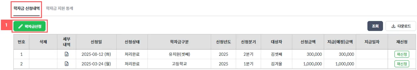 학자금 신청 및 내역을 확인하는 화면입니다.