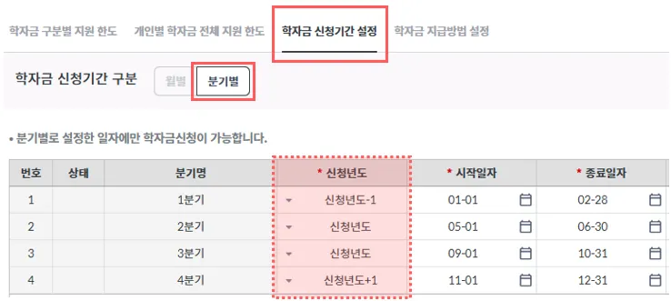 분기별 : 분기별 신청가능한 년도 및 일자를 지정