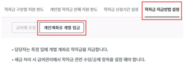 개인계좌로 개별 입금 : 학자금 신청시 은행 및 계좌번호를 등록할 수 있는 옵션