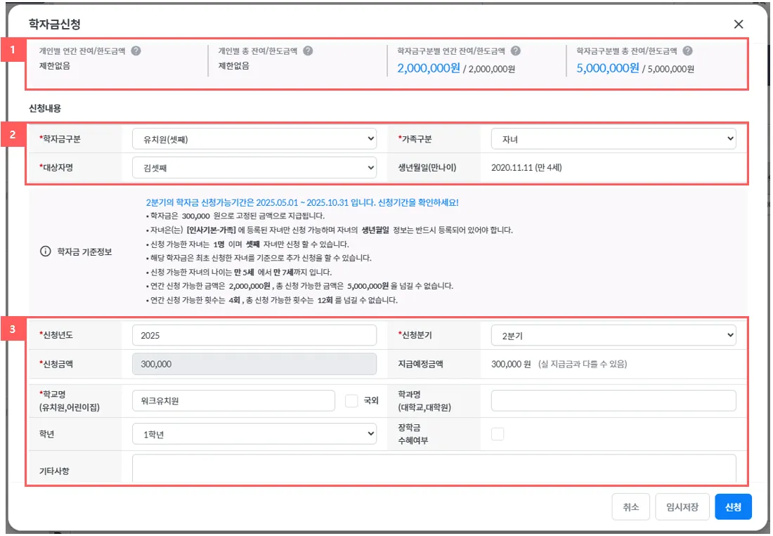 ② 개인이 총 신청할 수 있는 학자금 총 한도와 연간 지원 한도 설정 (가족포함 신청)