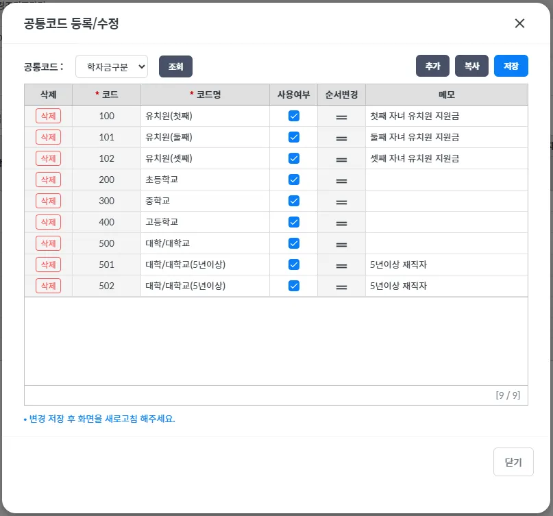 학자금 사용기준 및 대상자 조건등을 설정하는 화면입니다.
