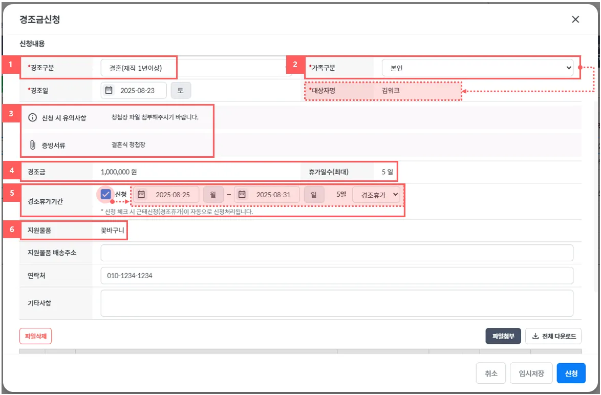 설정해 놓은 회사 기준 정보로 경조 신청을 할 수 있습니다.