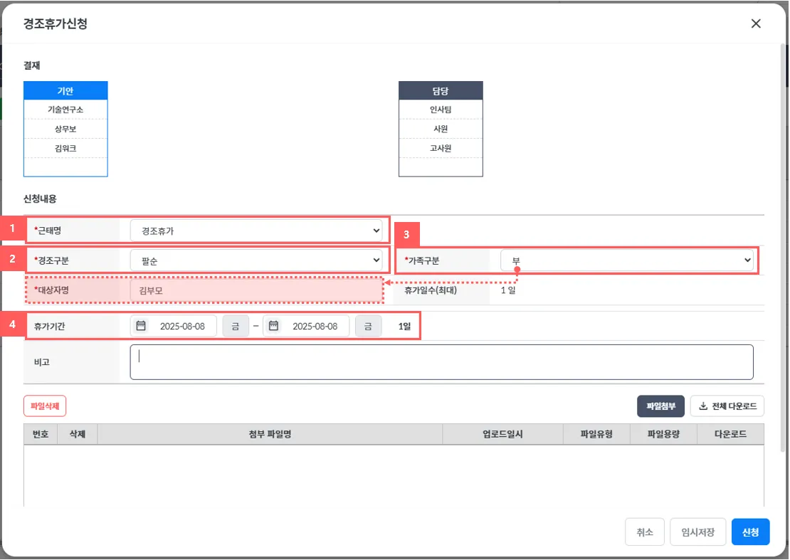 경조휴가신청은 필수값이 아니며 추후 경조휴가신청을 별도로 진행해도 됨