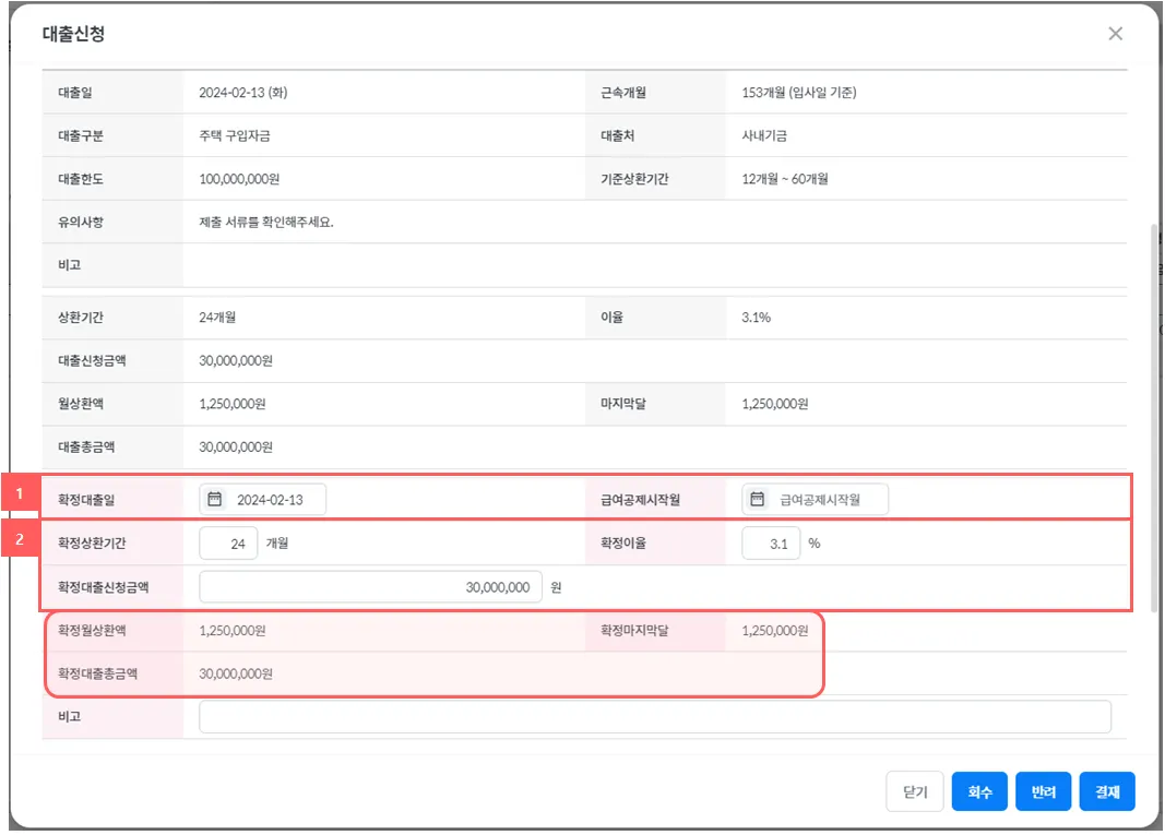 ③ 대출신청 이후 담당자가 확인 및 수정한 내역 확인