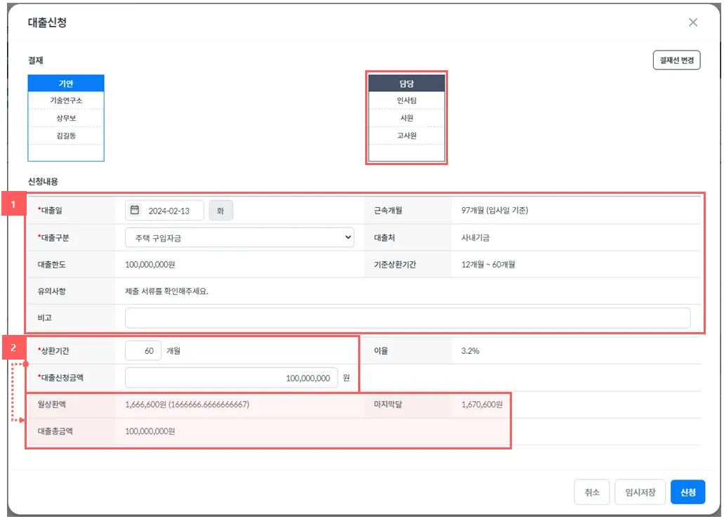 임직원이 신청한 금액, 요율이 무조건 적용되지 않으며 인사담당자가 검토 후 최종 금액과 이율등을 확인 혹은 수정하여 승인합니다.