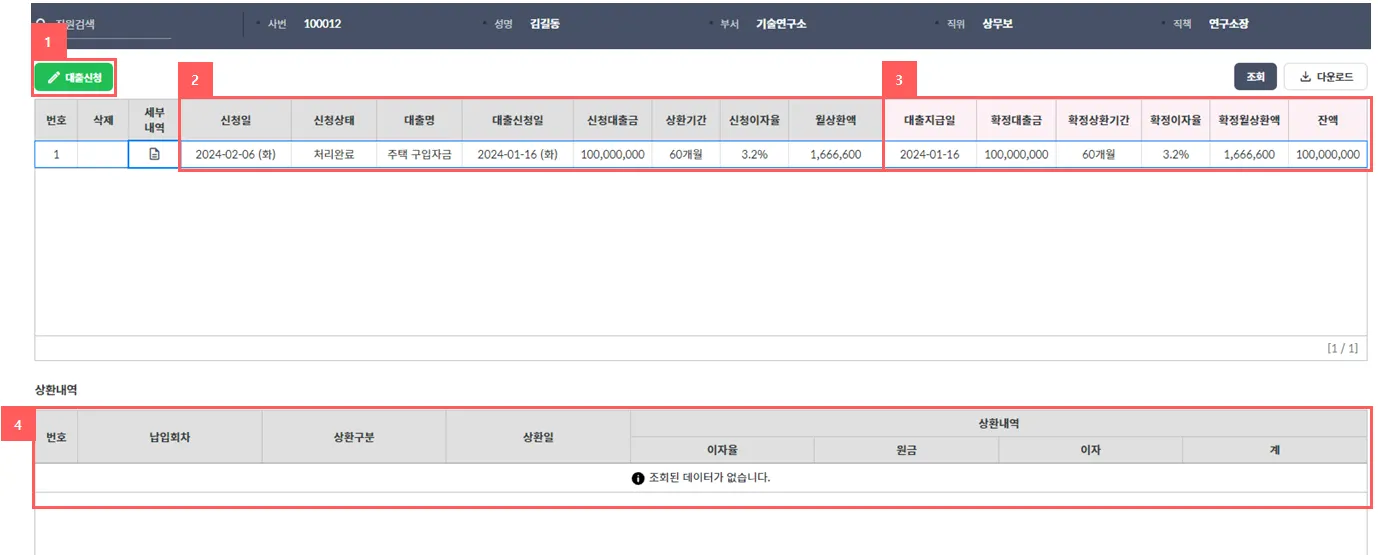 임직원들이 대출신청 하는 화면입니다.